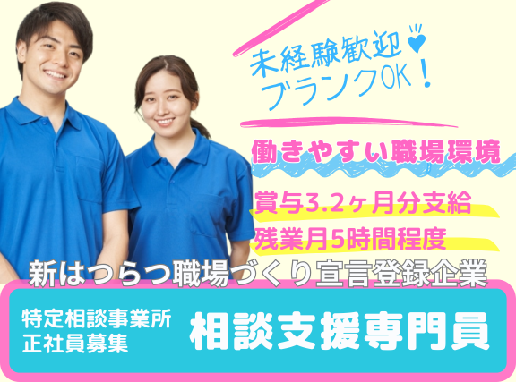 | 求める人材 | 年齢制限あり (~59歳) 学歴・経験不問 必要な免許・資格: 【必須】 相談支援従事者初任者研修 普通自動車運転免許必須(AT限定可) |