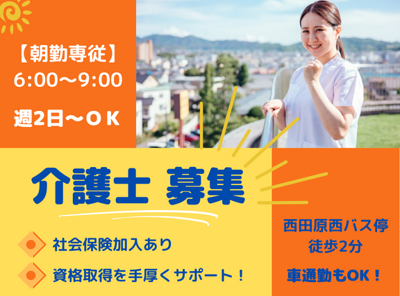 | 仕事内容 | 入浴・食事・排泄介助など基本的な介護業務。この時間帯は起床介助や食事介助などがメインとなります。入居者さんはもちろん、スタッフも一緒に楽しめる職場です。仕事の内容など詳しくはHPをご覧下さい。 ■変更範囲:会社の定める業務 |