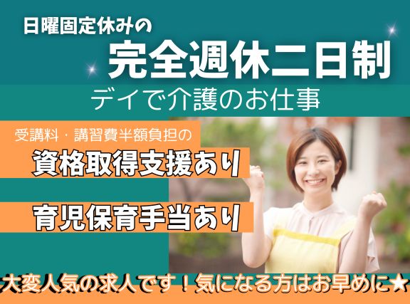 | 勤務先 | デイサービスセンターきらり ※基本転勤なし(当社の定める範囲内で変更あり) |