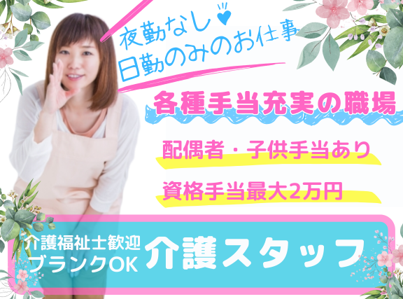 | 求める人材 | 初任者研修以上の介護資格必須 認知症介護基礎研修 必須 |