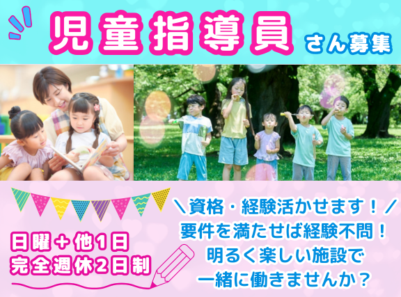| 求める人材 | 児童指導員は下記①②のいずれかに該当する方です。 ■資格要件 ① 社会福祉士・小学校教諭・中学校教諭・高等学校教諭・幼稚園教諭・児童指導員任用資格 いずれかお持ちの方 ※未経験可・ブランク可・新卒可・年齢不問 ■実務経験要件 ① 児童福祉施設(児童発達支援・放課後等デイサービス・児童館・児童養護施設など)での経験が高卒者は2年以上、中卒者は3年以上 ② 障害福祉サービスでの経験が高卒者は2年以上、中卒者は該当しません。 ※ブランク可・年齢不問・自動車免許 |
