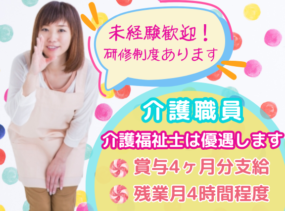 | 仕事内容 | ●入居者の食事、入浴、更衣、排せつなどの介助 ●日常生活の支援、介護サービスの提供 ●レクリエーションなどの企画・運営 ■変更範囲:会社の定める業務 |