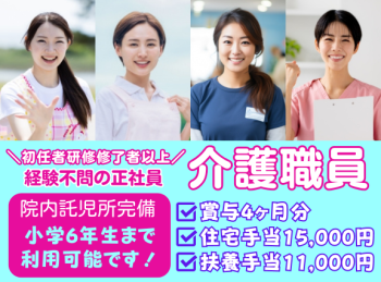| 待遇 | ■給与 月給 245,000円~275,000円 内訳 基本給(月額平均)155,000円~175,000円 資格手当25,000円~35,000円 職務手当50,000円 交通手当15,000円 固定残業代なし ■手当 管理者候補の場合 100,000円 実績手当:2,000円~5,000円 昇給あり 1月あたり3,000円~10,000円(前年度実績) 通勤手当 実費支給(上限あり月額30,000円) ■福利厚生 雇用保険,労災保険,健康保険,厚生年金 退職金共済加入 退職金あり 定年制あり(定年年齢一律60歳) 再雇用制度あり(上限年齢上限65歳まで) 勤務延長あり 育児休業取得実績あり 職務給制度あり(職種による) 復職制度あり マイカー通勤可(駐車場あり) 研修制度あり(喀痰吸引研修等) ※各種保険に加入しています(介護事業者賠償責任保障制度、感染見舞金制度) ※人間ドック、定期健康診断を提携健診センターで受けて頂きます(無料) ※インフルエンザ予防接種(無料) |