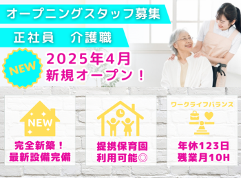 2025年5月に新規開設予定。オープニングスタッフの募集です!...給与 月給 195,000円〜235,000円 交通 名古屋市営地下鉄東山線 星ヶ丘駅から徒歩で15分 勤務時間 【初任者研修以上・介護福祉/日勤のみ】